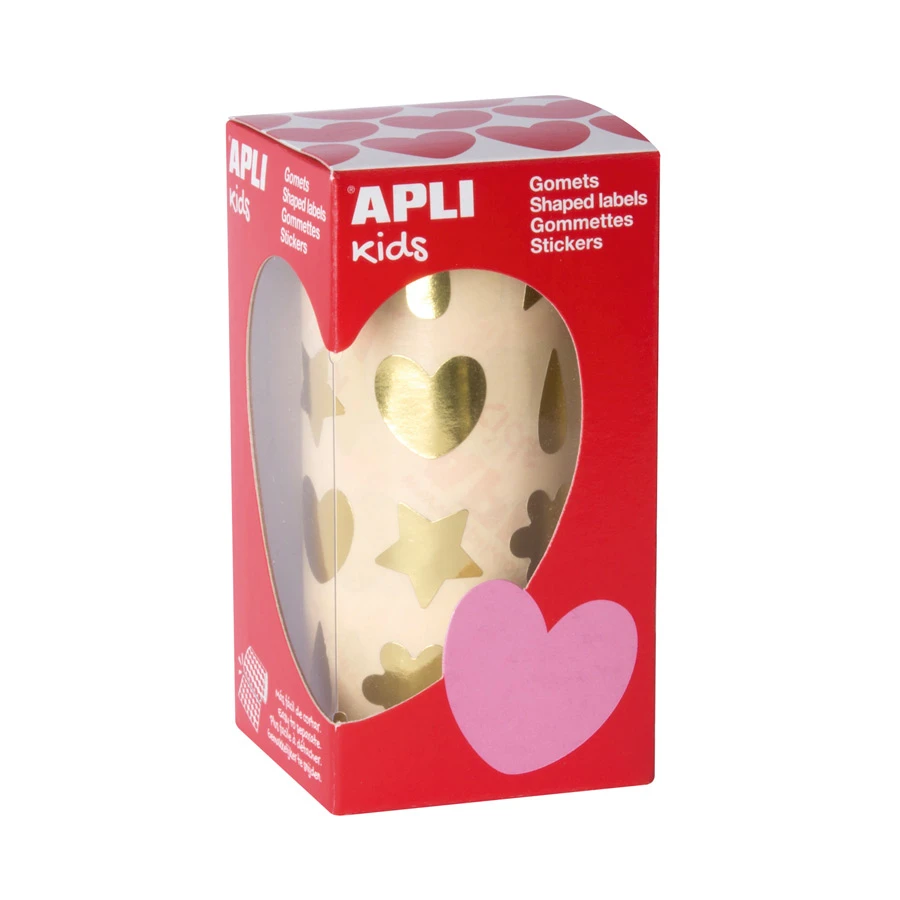 Aufkleber golden mit 4 verschiedenen Formen: Blume (20 x 18 mm), Tropfen (7,8 x 18,8 mm), Stern (18,5 x 19,4 mm) und Herz (20 x 18,4 mm). Jede Rolle enthält 30 vorgeschnittene Blätter, die leicht zu entfernen sind, 720 Aufkleber pro Rolle (180 Aufkleber/Form)