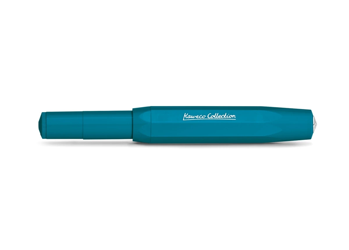 Die Kaweco Ikone, das Sportmodell aus hochwertigem Kunststoff, wird ab Winter 2021 um den Farbton Cyan in der Kaweco Collection erweitert. Die klare Farbe in Verbindung mit den silbernen Akzenten verleiht dem Schreibgerät einen eleganten Charakter. Auf einer Seite harmoniert die kühle Wirkung des Cyans optimal mit der frostigen Jahreszeit, andererseits erinnert es an die ästhetische Wasserfärbung der karibischen See und regt zum Träumen an.